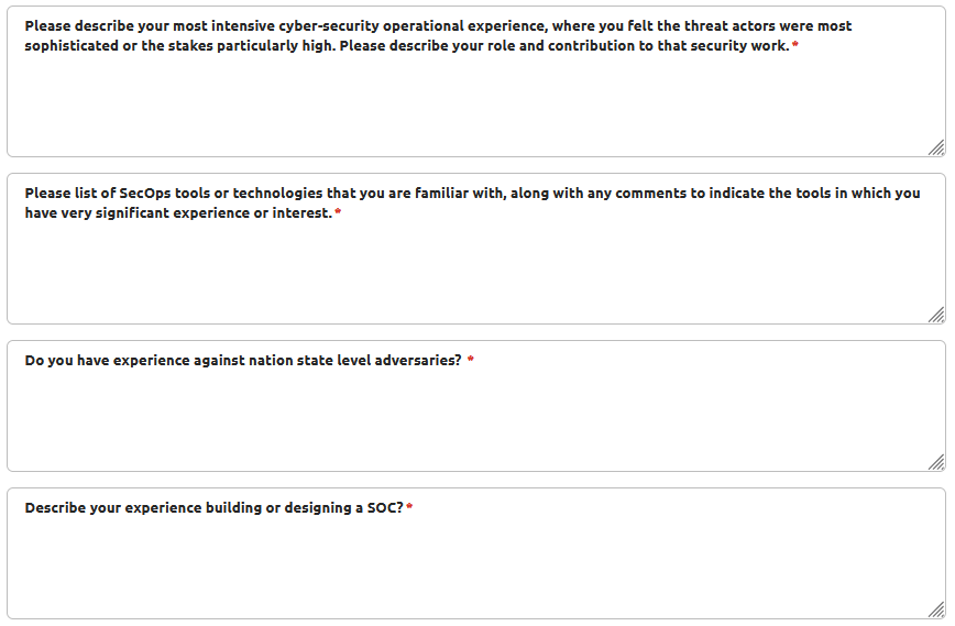 None of this - none of it at all - is remotely relevant to the actual day-to-day job of a Head of Security Operations. Again, these are questions that cannot be answered appropriately in character-capped text fields. But beyond that, these are questions that should not - ever - be used to screen applicants. Applicants for a role where these requirements are not even remotely relevant.